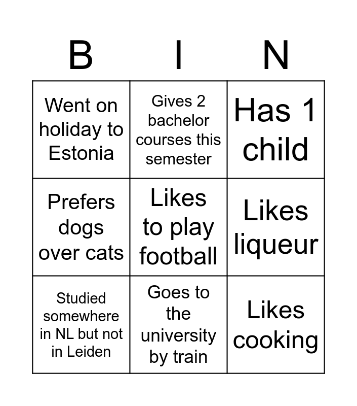 This bingo card has 9 words: Studied somewhere in NL but not in Leiden, Has 1 child, Gives 2 bachelor courses this semester, Prefers dogs over cats, Went on holiday to Estonia, Likes liqueur, Likes to play football, Likes cooking and Goes to the university by train.