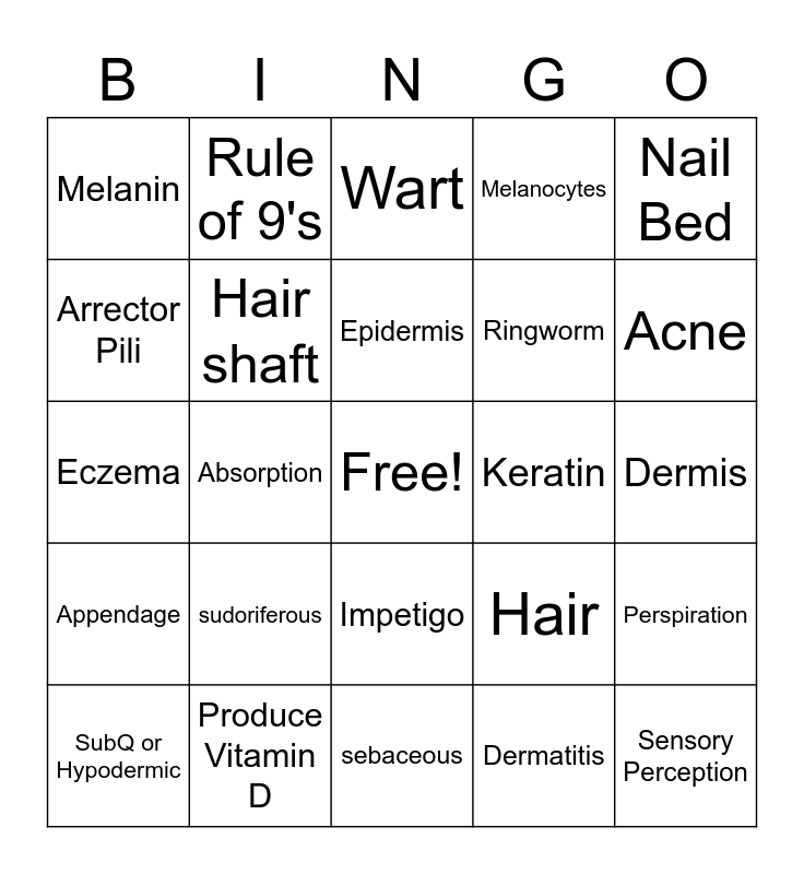 This bingo card has a free space and 24 words: sudoriferous, Produce Vitamin D, Epidermis, SubQ or Hypodermic, Nail Bed, Melanin, Arrector Pili, Rule of 9's, Keratin, Impetigo, Ringworm, Eczema, Hair, Perspiration, Hair shaft, Dermatitis, Dermis, Wart, Acne, Absorption, Sensory Perception, Appendage, Melanocytes and sebaceous.