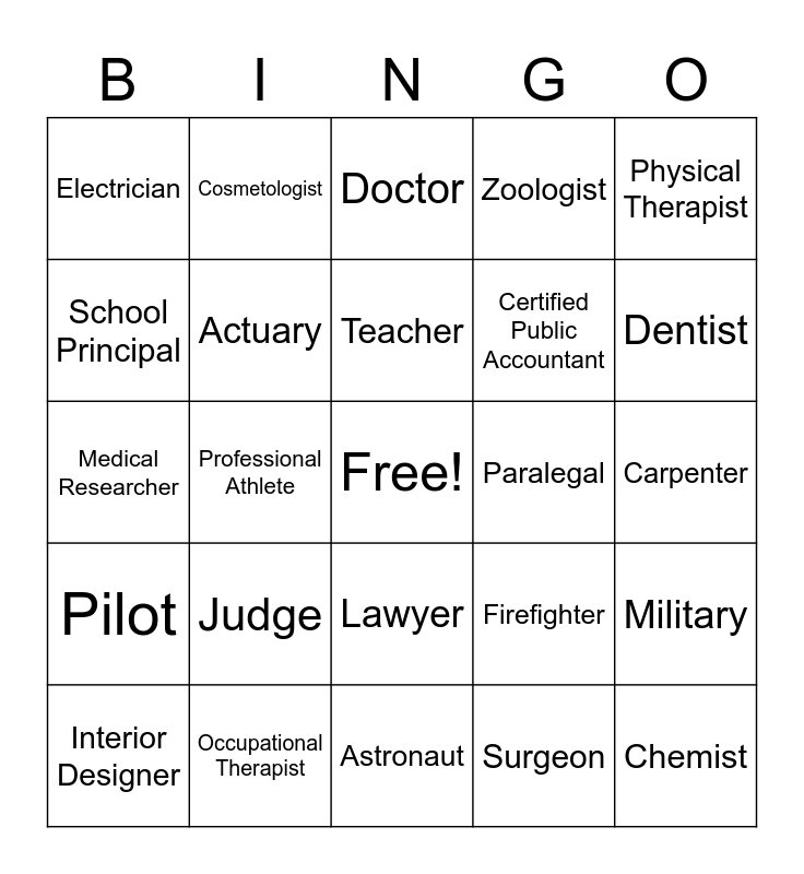 This bingo card has a free space and 44 words: Mechanical Engineer, Chemist, Architect, Interior Designer, Journalist, Surgeon, Doctor, Nurse, Physical Therapist, Occupational Therapist, Zoologist, Paralegal, Lawyer, Judge, Politician, Astronaut, Librarian, Medical Researcher, Dental Hygienist, Dentist, Cosmetologist, Locksmith, Plumber, Electrician, Auto Mechanic, Carpenter, Landscape Architect, Police Officer, Firefighter, Pilot, Chef, Military, Court Stenographer, Realtor, Professional Athlete, Business Owner, Computer Programmer/IT, School Counselor, Teacher, School Principal, Certified Public Accountant, Financial Planner, Actuary and Civil Engineer.