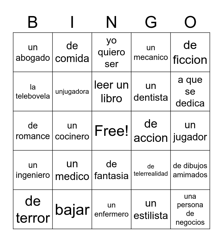 This bingo card has a free space and 24 words: un medico, bajar, leer un libro, de terror, de ficcion, un abogado, la telebovela, de comida, de accion, de fantasia, un dentista, de romance, de telerrealidad, de dibujos amimados, unjugadora, un estilista, un jugador, yo quiero ser, a que se dedica, un cocinero, una persona de negocios, un ingeniero, un mecanico and un enfermero.