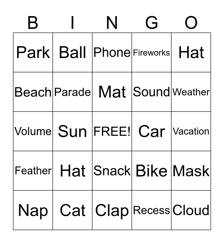 This bingo card has a free space and 24 words: Hat, Cat, Mat, Nap, Hat, Park, Beach, Ball, Car, Snack, Sound, Volume, Bike, Mask, Parade, Recess, Vacation, Phone, Weather, Sun, Cloud, Feather, Fireworks and Clap.