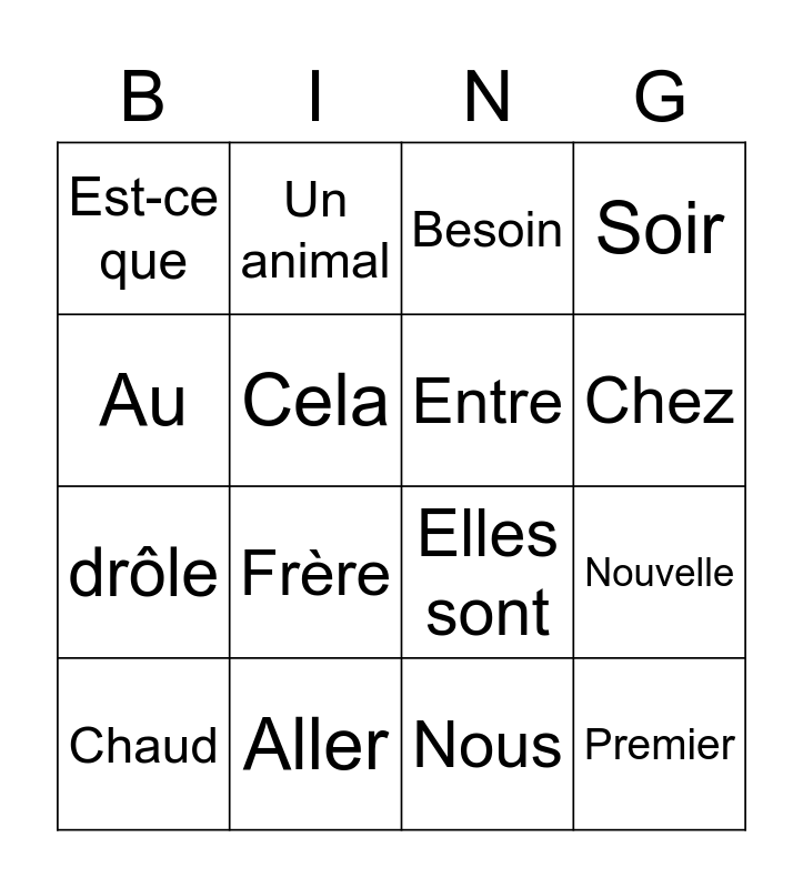 This bingo card has 20 words: Nouvelle, Qu’est-ce que, Besoin, Il donne, Chaud, Au, Aller, Est-ce que, drôle, Un animal, Frère, Elles sont, Cela, Premier, Entre, Quelque, Chez, Soir, Nous and Je pense.