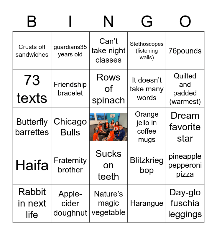 This bingo card has a free space and 64 words: sweven-497, Morgan Freeman, Miss Fruittree, pineapple pepperoni pizza, Grammy award, onomatophobia, guardians35 years old, Rock candy, Rows of spinach, Annoying fly, Sucks on teeth, Chickpeas- scent, Dream favorite star, 76pounds, October, 12 4th grade, 73 texts, Chicago Bulls, Crusts off sandwiches, Prattling, It doesn’t take many words, Fraternity brother, Haifa, Stethoscopes (listening walls), 1008, Smiles with 32 teeth, 2 pizza parties, Waterfountain trick999 ornaments, Queen Mother of Heavens, Turtle shaped cake, Gray blanket cape, Think better after eaten, Homemade compass, Teeth and claws are poisonKum River, 2 full moons, Quilted and padded (warmest), Rabbit in next life, Tithe, Harangue, Well kept traditionAcorn, Friendship bracelet, Butterfly barrettes, Orange jello in coffee mugs, Blackbird feather, Words like razors, MonopolySkirt made of snakes, Day-glo fuschia leggings, Apple-cider doughnut, Blueberry and cashew pancakes, Blitzkrieg bop, Finger-tip test, Cat’s cradleYellow room, Rattlesnake hunters, Nature’s magic vegetable, Award for selling girl scout cookies, Need water to make mud, Wet notebook, Can’t take night classes, 7 comics, haggis, New Dehli, cultural enrichment, wax figures, EMF meter and cut lock on gate.