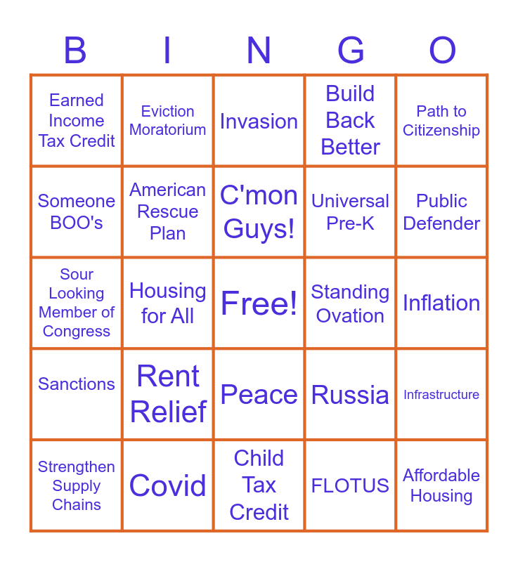 This bingo card has a free space and 50 words: Child Care, Affordable Housing, Immigration Reform, Child Tax Credit, Rent Relief, Supporting Children & Families, Eviction Moratorium, Malarkey, Someone BOO's, Disadvantaged, American Rescue Plan, Build Back Better, Infrastructure, Russia, Putin, Ukraine, C'mon Guys!, Standing Ovation, Ketanji Brown Jackson, Path to Citizenship, Housing for All, FLOTUS, Earned Income Tax Credit, Universal Pre-K, Bridges and Roads, Economic Justice, Public Defender, January 6th, Invasion, Peace, NATO, ITIN Filers, Voting Rights, LGBTQIA Rights, Covid, 200 Million Vaccinated, Unemployment Insurance, Health Care/ Medicare/ Medicaid Expansion, Climate Change, Inflation, Gas Prices, Fair Share, Camera shows someone NOT clapping, Supreme Court, Strengthen Supply Chains, Sour Looking Member of Congress, Eye Roll, VP Harris, Sanctions and First Dude (VP Husband) on Camera.