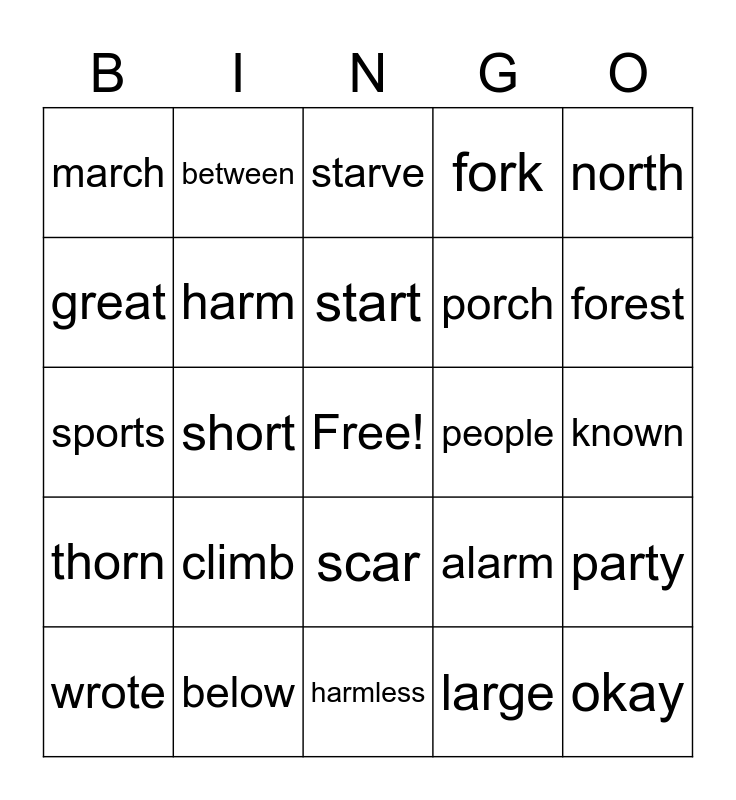 This bingo card has a free space and 24 words: climb, below, start, wrote, north, march, great, between, people, scar, porch, sports, alarm, party, harm, large, known, starve, forest, short, okay, thorn, fork and harmless.