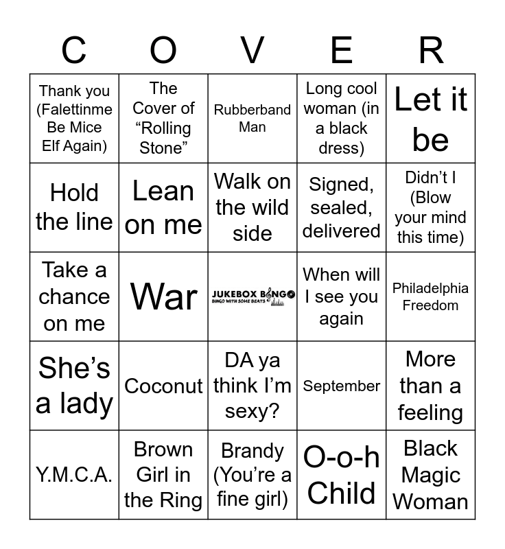 This bingo card has a free space and 51 words: Back Stabbers, Black Magic Woman, Cat Scratch Fever, Brandy (You’re a fine girl), Coconut, Come and get your love, The Cover of “Rolling Stone”, Got to be real, Hold the line, I can see Clearly now, Lean on me, Long cool woman (in a black dress), More than a feeling, September, Play that funky music, Two tickets to paradise, Walk on the wild side, When will I see you again, IN the summertime, Let it be, War, O-o-h Child, Thank you (Falettinme Be Mice Elf Again), Signed, sealed, delivered, Lookin’ out my back door, Green eyed lady, Didn’t I (Blow your mind this time), (Don’t fear) The Reaper, Y.M.C.A., Rubberband Man, Grease, Love Machine, Funkytown, Heart of Glass, Mamma Mia, Brown Girl in the Ring, DOn’t stop ’Til you get enough, Love’s Theme, Don’t leave me this way, Love will keep us together, Philadelphia Freedom, She’s a lady, Dancing in the moonlight, Don’t stop me now, Shine a little love, Ring my bell, Take a chance on me, Blame it on the boogie, We are Family, DA ya think I’m sexy? and Dancing Machine.