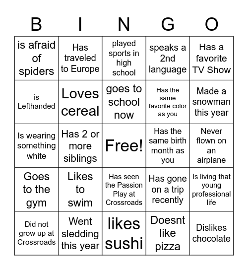 This bingo card has a free space and 24 words: Likes to swim, Went sledding this year, goes to school now, Did not grow up at Crossroads, Has a favorite TV Show, is afraid of spiders, is Lefthanded, Has traveled to Europe, Has the same birth month as you, Has seen the Passion Play at Crossroads, Has the same favorite color as you, Is wearing something white, Has gone on a trip recently, Is living that young professional life, Loves cereal, Doesnt like pizza, Never flown on an airplane, played sports in high school, Made a snowman this year, Has 2 or more siblings, Dislikes chocolate, Goes to the gym, speaks a 2nd language and likes sushi.