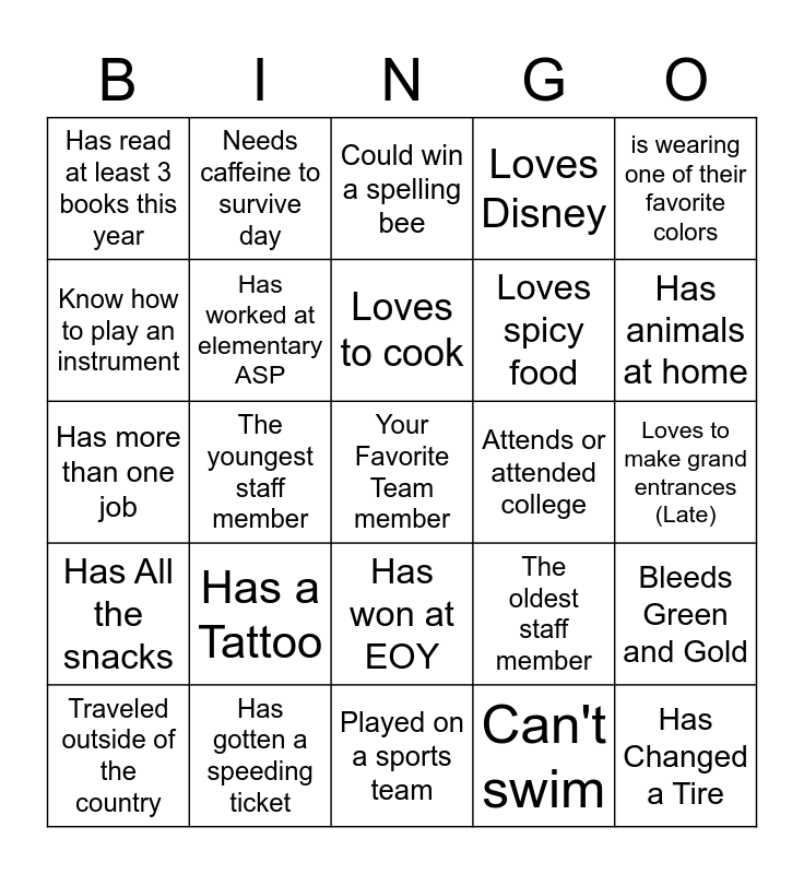 This bingo card has a free space and 24 words: Has a Tattoo, Has gotten a speeding ticket, Loves to cook, Traveled outside of the country, is wearing one of their favorite colors, Has read at least 3 books this year, Know how to play an instrument, Needs caffeine to survive day, Attends or attended college, Has won at EOY, Loves spicy food, Has more than one job, The oldest staff member, Bleeds Green and Gold, Has worked at elementary ASP, Can't swim, Loves to make grand entrances (Late), Could win a spelling bee, Has animals at home, The youngest staff member, Has Changed a Tire, Has All the snacks, Loves Disney and Played on a sports team.