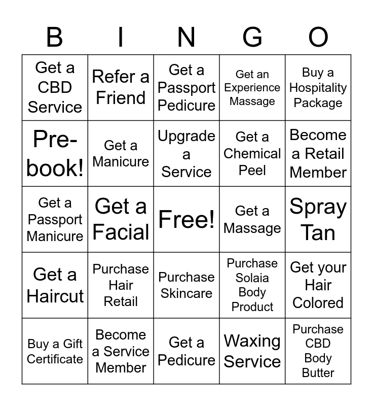 This bingo card has a free space and 24 words: Purchase Hair Retail, Become a Service Member, Upgrade a Service, Buy a Gift Certificate, Buy a Hospitality Package, Get a CBD Service, Pre-book!, Refer a Friend, Get a Massage, Purchase Skincare, Get a Chemical Peel, Get a Passport Manicure, Purchase Solaia Body Product, Get your Hair Colored, Get a Manicure, Waxing Service, Spray Tan, Get a Passport Pedicure, Become a Retail Member, Get a Facial, Purchase CBD Body Butter, Get a Haircut, Get an Experience Massage and Get a Pedicure.