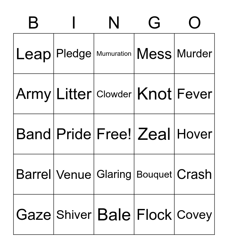 This bingo card has a free space and 35 words: Shrewdness, Herd, Shoal, Litter, Glaring, Mess, Army, Huddle, Clowder, Drove, Band, Murder, Mob, Charm, Leap, Zeal, Flock, Pride, Barrel, Covey, Bouquet, Gaze, Crash, Shiver, Mumuration, Fever, Bevy, Ambush, Knot, Hover, Posse, Bale, Venue, Pledge and Pod.