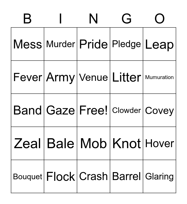 This bingo card has a free space and 35 words: Shrewdness, Herd, Shoal, Litter, Glaring, Mess, Army, Huddle, Clowder, Drove, Band, Murder, Mob, Charm, Leap, Zeal, Flock, Pride, Barrel, Covey, Bouquet, Gaze, Crash, Shiver, Mumuration, Fever, Bevy, Ambush, Knot, Hover, Posse, Bale, Venue, Pledge and Pod.