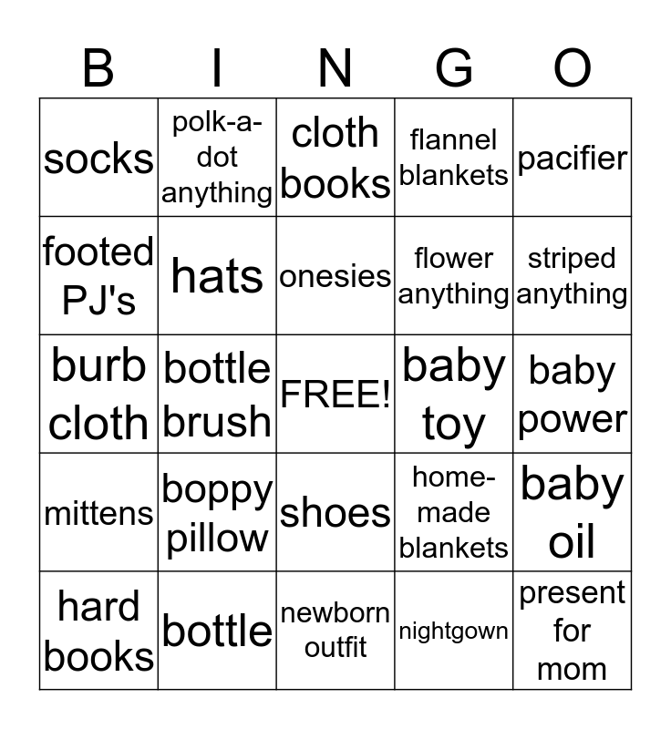 This bingo card has a free space and 24 words: boppy pillow, bottle, onesies, hard books, pacifier, socks, footed PJ's, polk-a-dot anything, baby toy, shoes, flower anything, burb cloth, home-made blankets, baby oil, hats, nightgown, baby power, cloth books, striped anything, bottle brush, present for mom, mittens, flannel blankets and newborn outfit.