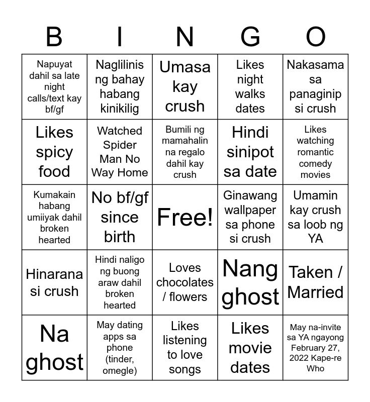 This bingo card has a free space and 24 words: Hindi naligo ng buong araw dahil broken hearted, May dating apps sa phone (tinder, omegle), Bumili ng mamahalin na regalo dahil kay crush, Na ghost, Nakasama sa panaginip si crush, Napuyat dahil sa late night calls/text kay bf/gf, Likes spicy food, Naglilinis ng bahay habang kinikilig, Ginawang wallpaper sa phone si crush, Loves chocolates / flowers, Hindi sinipot sa date, Kumakain habang umiiyak dahil broken hearted, Nang ghost, Taken / Married, Watched Spider Man No Way Home, Likes movie dates, Umamin kay crush sa loob ng YA, Umasa kay crush, Likes watching romantic comedy movies, No bf/gf since birth, May na-invite sa YA ngayong February 27, 2022 Kape-re Who, Hinarana si crush, Likes night walks dates and Likes listening to love songs.