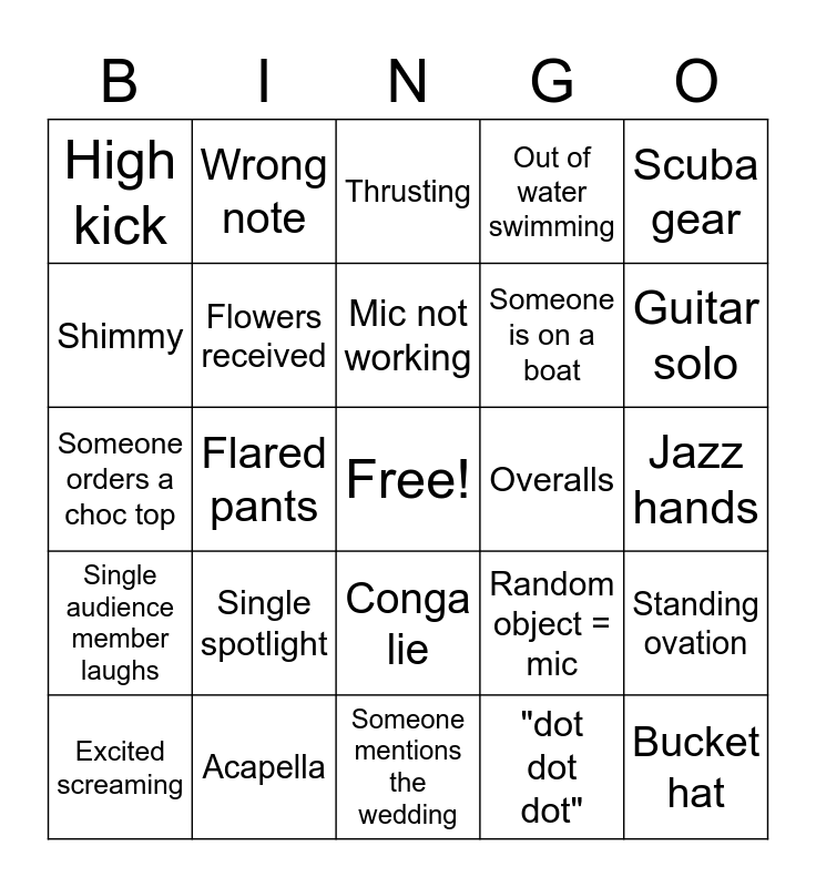 This bingo card has a free space and 24 words: Single spotlight, Acapella, Mic not working, Excited screaming, Scuba gear, High kick, Shimmy, Wrong note, Overalls, Conga lie, Someone is on a boat, Someone orders a choc top, Random object = mic, Standing ovation, Flowers received, "dot dot dot", Jazz hands, Thrusting, Guitar solo, Flared pants, Bucket hat, Single audience member laughs, Out of water swimming and Someone mentions the wedding.