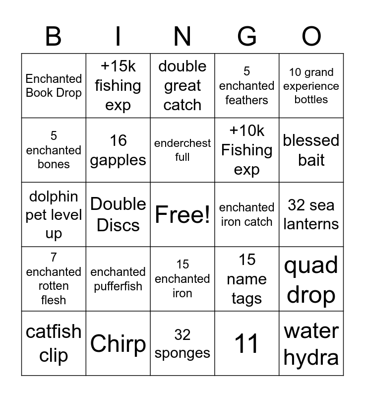 This bingo card has a free space and 30 words: Chirp, Blocks, Double Discs, Carrot Bait, Enchanted Book Drop, double great catch, 16 gapples, 15 enchanted iron, enchanted iron catch, 32 sponges, 32 sea lanterns, water hydra, 11, 13, blessed bait, spiked bait, 15 name tags, 7 enchanted rotten flesh, enchanted pufferfish, 10 grand experience bottles, dolphin pet level up, 100 exp levels, +15k fishing exp, +10k Fishing exp, 5 enchanted bones, 5 enchanted feathers, quad drop, catfish clip, enderchest full and night squid.