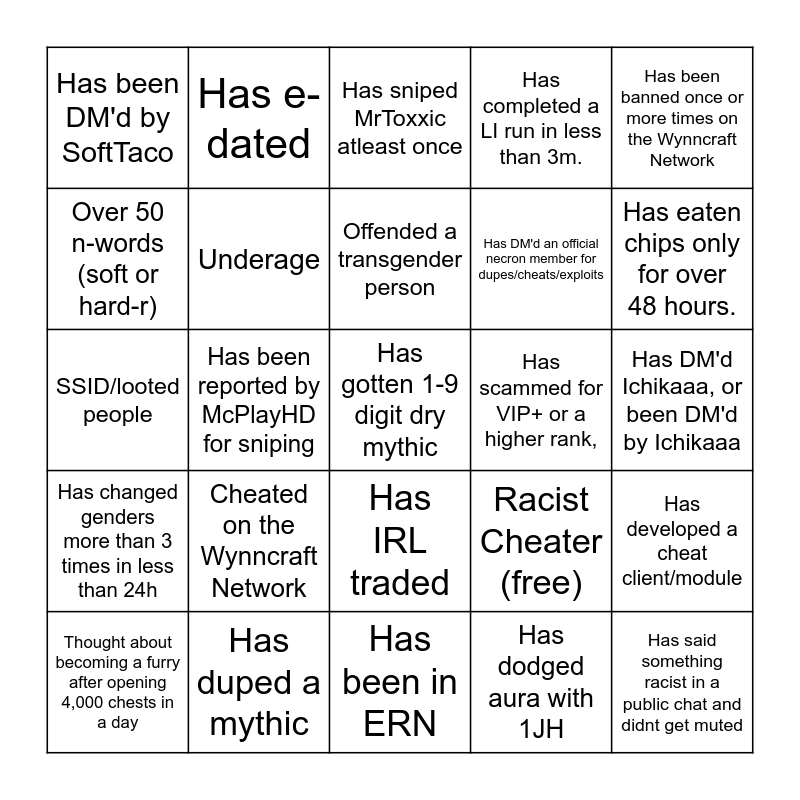 This bingo card has 25 words: Cheated on the Wynncraft Network, Has been in ERN, Offended a transgender person, Thought about becoming a furry after opening 4,000 chests in a day, Has been banned once or more times on the Wynncraft Network, Has been DM'd by SoftTaco, Over 50 n-words (soft or hard-r), Has e-dated, Has scammed for VIP+ or a higher rank,, Has IRL traded, Has DM'd an official necron member for dupes/cheats/exploits, SSID/looted people, Racist Cheater (free), Has developed a cheat client/module, Underage, Has said something racist in a public chat and didnt get muted, Has DM'd Ichikaaa, or been DM'd by Ichikaaa, Has sniped MrToxxic atleast once, Has eaten chips only for over 48 hours., Has been reported by McPlayHD for sniping, Has gotten 1-9 digit dry mythic, Has duped a mythic, Has changed genders more than 3 times in less than 24h, Has completed a LI run in less than 3m. and Has dodged aura with 1JH.
