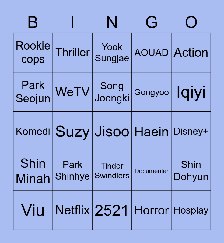This bingo card has a free space and 24 words: Park Shinhye, Netflix, Song Joongki, Viu, Action, Rookie cops, Park Seojun, Thriller, Haein, Tinder Swindlers, Gongyoo, Komedi, Documenter, Shin Dohyun, WeTV, Horror, Disney+, Yook Sungjae, Iqiyi, Suzy, Hosplay, Shin Minah, AOUAD and 2521.