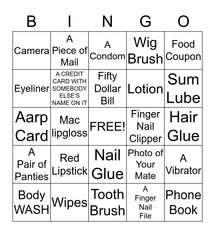 This bingo card has a free space and 24 words: Red Lipstick, Wipes, Fifty Dollar Bill, Body WASH, Food Coupon, Camera, Eyeliner, A Piece of Mail, Finger Nail Clipper, Nail Glue, Lotion, Aarp Card, Photo of Your Mate, A Vibrator, A CREDIT CARD WITH SOMEBODY ELSE'S NAME ON IT, A Finger Nail File, Hair Glue, A Condom, Sum Lube, Mac lipgloss, Phone Book, A Pair of Panties, Wig Brush and Tooth Brush.
