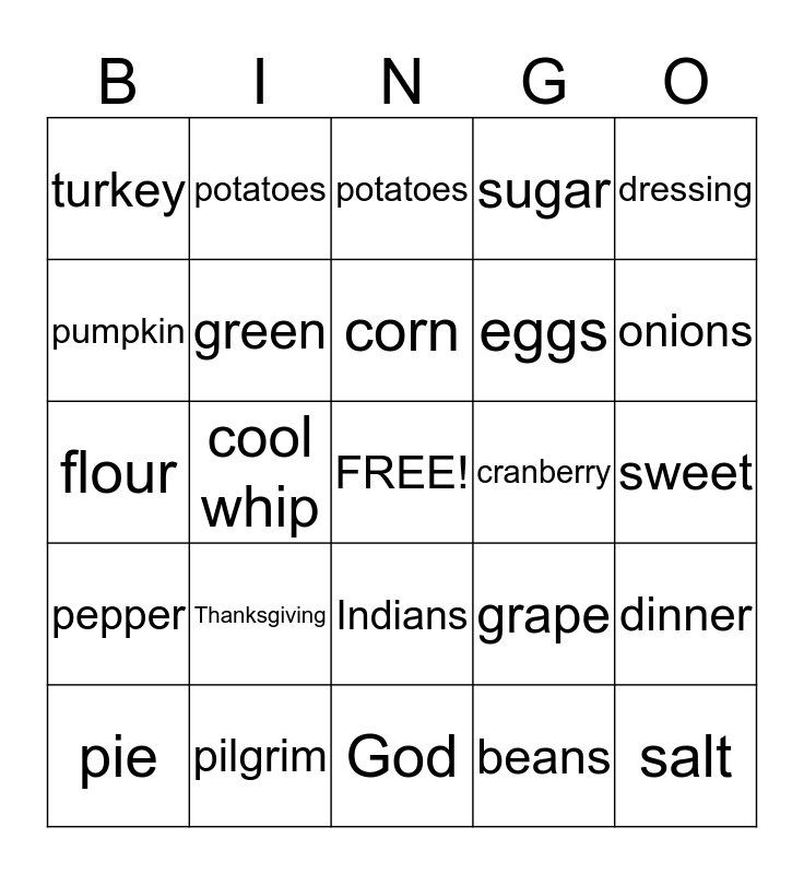 This bingo card has a free space and 24 words: Thanksgiving, pilgrim, corn, pie, dressing, turkey, pumpkin, potatoes, cranberry, Indians, eggs, flour, grape, dinner, green, beans, sweet, potatoes, onions, cool whip, salt, pepper, sugar and God.