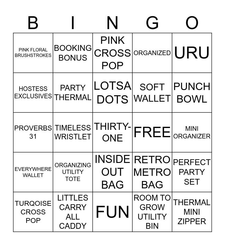 This bingo card has a free space and 24 words: ORGANIZING UTILITY TOTE, LITTLES CARRY ALL CADDY, LOTSA DOTS, TURQOISE CROSS POP, URU, PINK FLORAL BRUSHSTROKES, HOSTESS EXCLUSIVES, BOOKING BONUS, FREE, INSIDE OUT BAG, SOFT WALLET, PROVERBS 31, RETRO METRO BAG, PERFECT PARTY SET, PARTY THERMAL, ROOM TO GROW UTILITY BIN, MINI ORGANIZER, PINK CROSS POP, PUNCH BOWL, TIMELESS WRISTLET, THERMAL MINI ZIPPER, EVERYWHERE WALLET, ORGANIZED and FUN.