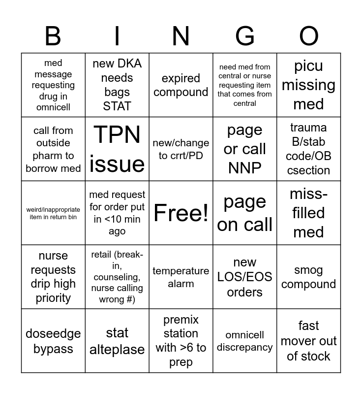 This bingo card has a free space and 41 words: missing lipid/adjust lipid time, weird/inappropriate item in return bin, compatibility question, TPN issue, stat alteplase, temperature alarm, new/change to crrt/PD, floorstock insulin, picu missing med, nurse requests drip high priority, med request for order put in <10 min ago, need med from central or nurse requesting item that comes from central, fast mover out of stock, miss-filled med, page on call, retail (break-in, counseling, nurse calling wrong #), call to borrow a med, med message requesting drug in omnicell, need new tackle box, expired compound, smog compound, new chemo/chemo issue, premix station with >6 to prep, page or call NNP, rec from a consult service, someone forgot PIN for tube, omnicell discrepancy, med not scanning (doseedge or nurse call), trauma B/stab code/OB csection, expired med (not compound), call from OR, new DKA needs bags STAT, doseedge bypass, brand new TPN, new LOS/EOS orders, call from outside pharm to borrow med, request for vfc vaccine, recon antibiotic, ID home med, status board clear and request for on call electrolytes.