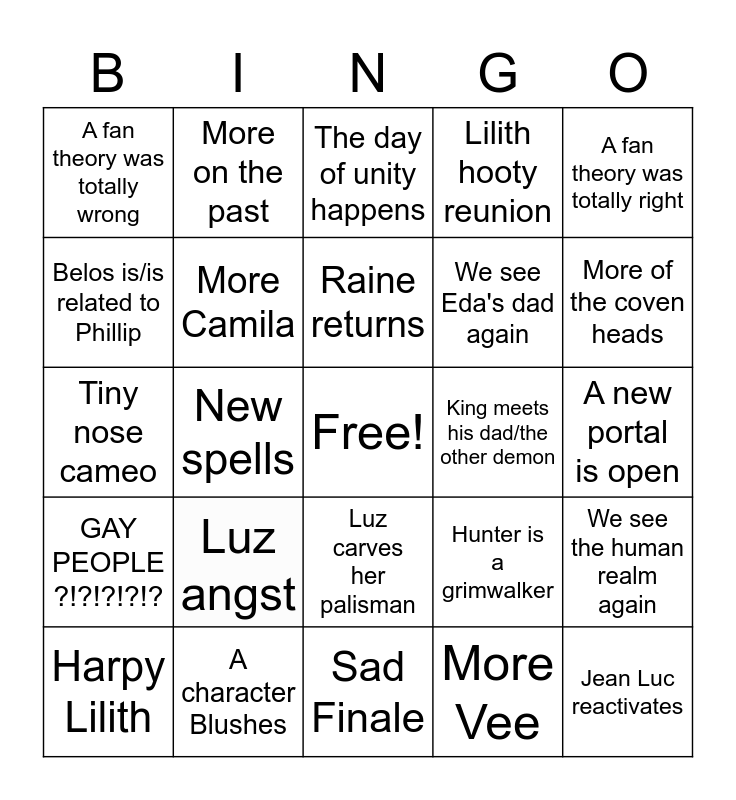 This bingo card has a free space and 24 words: Luz angst, A character Blushes, Raine returns, Harpy Lilith, A fan theory was totally right, A fan theory was totally wrong, Belos is/is related to Phillip, More on the past, King meets his dad/the other demon, Luz carves her palisman, We see Eda's dad again, Tiny nose cameo, Hunter is a grimwalker, We see the human realm again, More Camila, More Vee, A new portal is open, The day of unity happens, More of the coven heads, New spells, Jean Luc reactivates, GAY PEOPLE ?!?!?!?!?, Lilith hooty reunion and Sad Finale.
