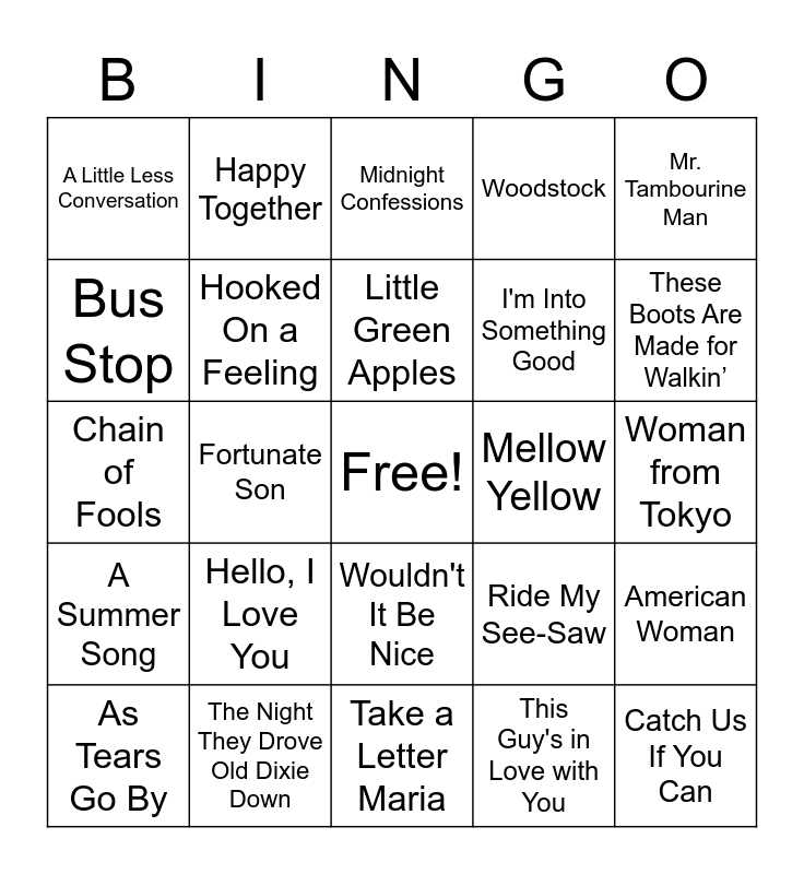 This bingo card has a free space and 40 words: Don't Bring Me Down, Chain of Fools, Windy, Hooked On a Feeling, The Night They Drove Old Dixie Down, Wouldn't It Be Nice, Little Green Apples, Julie, Do Ya Love Me, Mr. Tambourine Man, A Summer Song, Fortunate Son, Woodstock, Catch Us If You Can, Woman from Tokyo, Mellow Yellow, Hello, I Love You, Spooky, A Little Less Conversation, Wichita Lineman, Midnight Confessions, American Woman, This Guy's in Love with You, I'm Into Something Good, Bus Stop, Surf City, Somebody to Love, Sitting In Limbo, The Letter, The Poor Side Of Town, Sunny Afternoon, Monday, Monday, As Tears Go By, Last Train to Clarksville, Ride My See-Saw, These Boots Are Made for Walkin’, Take a Letter Maria, Evil Ways, Dizzy, Happy Together and Tell Her No.