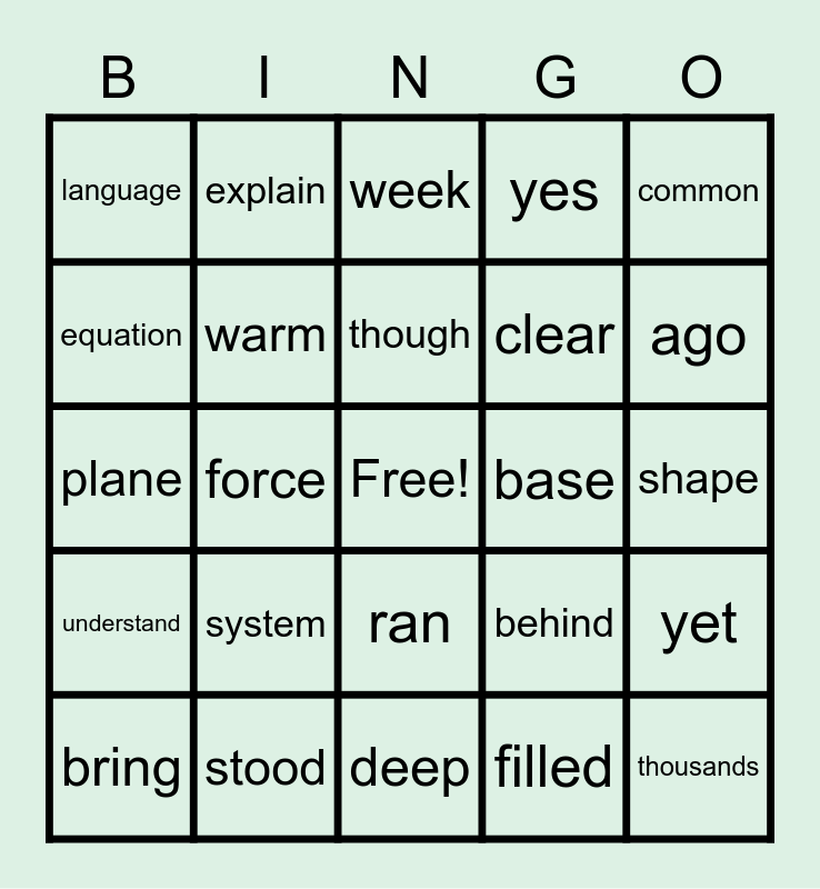 This bingo card has a free space and 33 words: boat, game, force, brought, understand, warm, common, bring, explain, dry, though, week, less, machine, base, ago, stood, plane, system, behind, ran, round, language, shape, deep, thousands, yes, clear, equation, yet, government, filled and heat.