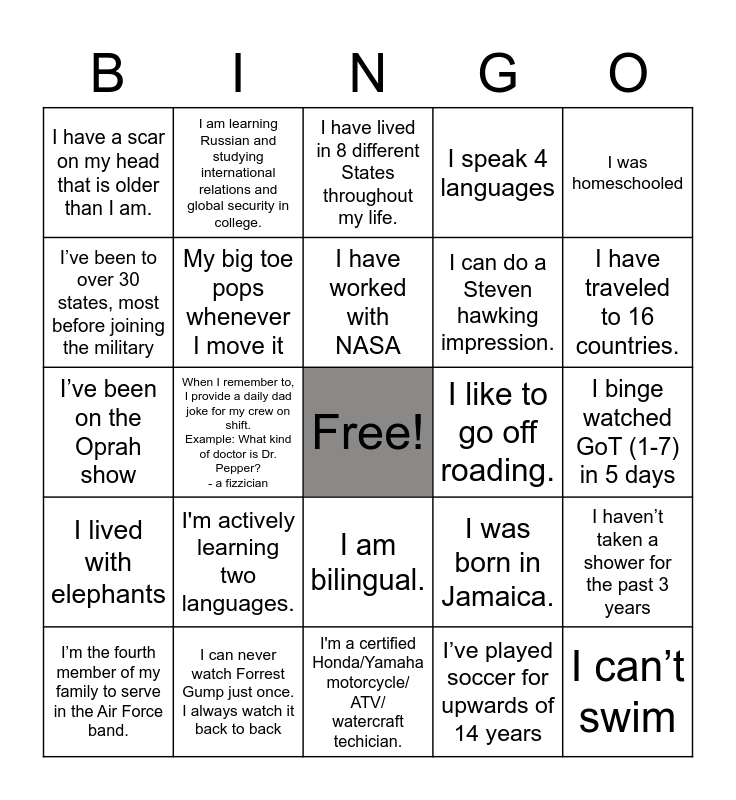 This bingo card has a free space and 24 words: I'm actively learning two languages., I can never watch Forrest Gump just once. I always watch it back to back, I have worked with NASA, I’m the fourth member of my family to serve in the Air Force band., I was homeschooled, I have a scar on my head that is older than I am., I’ve been to over 30 states, most before joining the military, I am learning Russian and studying international relations and global security in college., I like to go off roading., I am bilingual., I can do a Steven hawking impression., I’ve been on the Oprah show, I was born in Jamaica., I haven’t taken a shower for the past 3 years, My big toe pops whenever I move it, I’ve played soccer for upwards of 14 years, I binge watched GoT (1-7) in 5 days, I have lived in 8 different States throughout my life., I have traveled to 16 countries., When I remember to, I provide a daily dad joke for my crew on shift. Example: What kind of doctor is Dr. Pepper? - a fizzician, I can’t swim, I lived with elephants, I speak 4 languages and I'm a certified Honda/Yamaha motorcycle/ ATV/ watercraft techician..