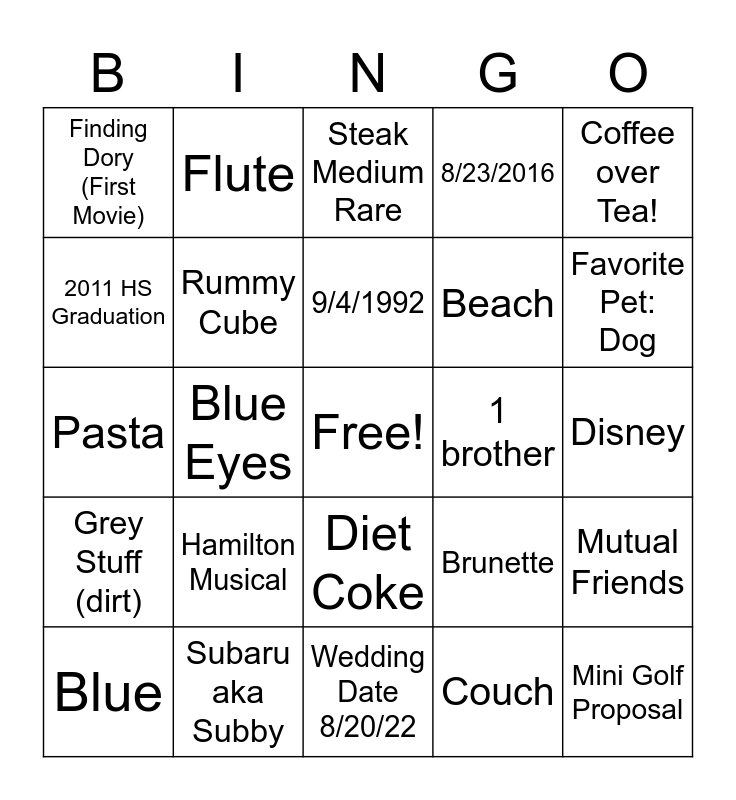 This bingo card has a free space and 32 words: Couch, West Chester, Blue Eyes, Broadway Shows, Grey Stuff (dirt), Rummy Cube, Coffee over Tea!, Mutual Friends, Flute, Mini Golf 1st Date, 9/4/1992, Steak Medium Rare, Margarita, 29, 1 brother, Start Dating 2016, Blue, Pasta, Diet Coke, Hamilton Musical, Brunette, Pocahontas, Disney, Subaru aka Subby, Mini Golf Proposal, 8/23/2016, Beach, 2011 HS Graduation, Finding Dory (First Movie), Wedding Date 8/20/22, Oboe and Favorite Pet: Dog.