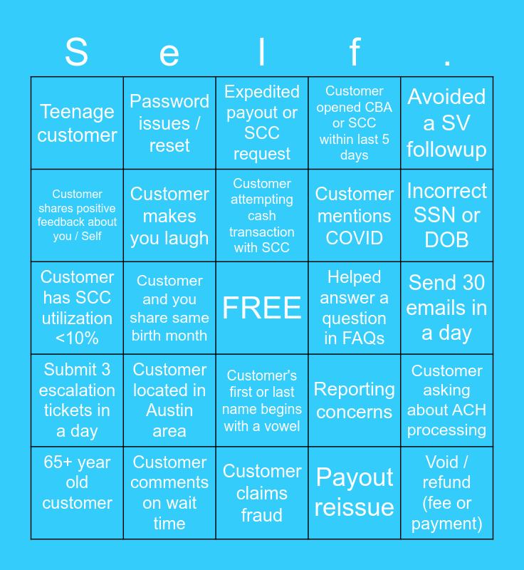 This bingo card has a free space and 24 words: Customer located in Austin area, Customer comments on wait time, Customer attempting cash transaction with SCC, 65+ year old customer, Avoided a SV followup, Teenage customer, Customer shares positive feedback about you / Self, Password issues / reset, Helped answer a question in FAQs, Customer's first or last name begins with a vowel, Customer mentions COVID, Customer has SCC utilization <10%, Reporting concerns, Customer asking about ACH processing, Customer makes you laugh, Payout reissue, Send 30 emails in a day, Expedited payout or SCC request, Incorrect SSN or DOB, Customer and you share same birth month, Void / refund (fee or payment), Submit 3 escalation tickets in a day, Customer opened CBA or SCC within last 5 days and Customer claims fraud.