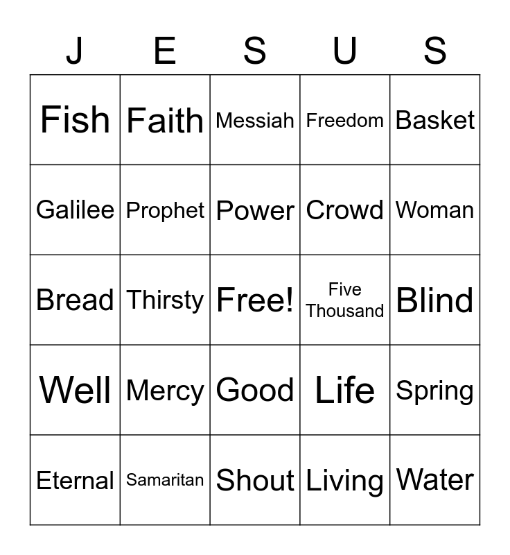 This bingo card has a free space and 35 words: Poor, Synagogue, Spirit, Prophet, Good, Freedom, Galilee, Taught, Power, Scripture, Bread, Basket, Mountain, Disciples, Fish, Five Thousand, Living, Thirsty, Well, Water, Life, Eternal, Spring, Samaritan, Messiah, Woman, Jesus, Jericho, Crowd, Blind, Roadside, Shout, Mercy, Faith and Jumped.