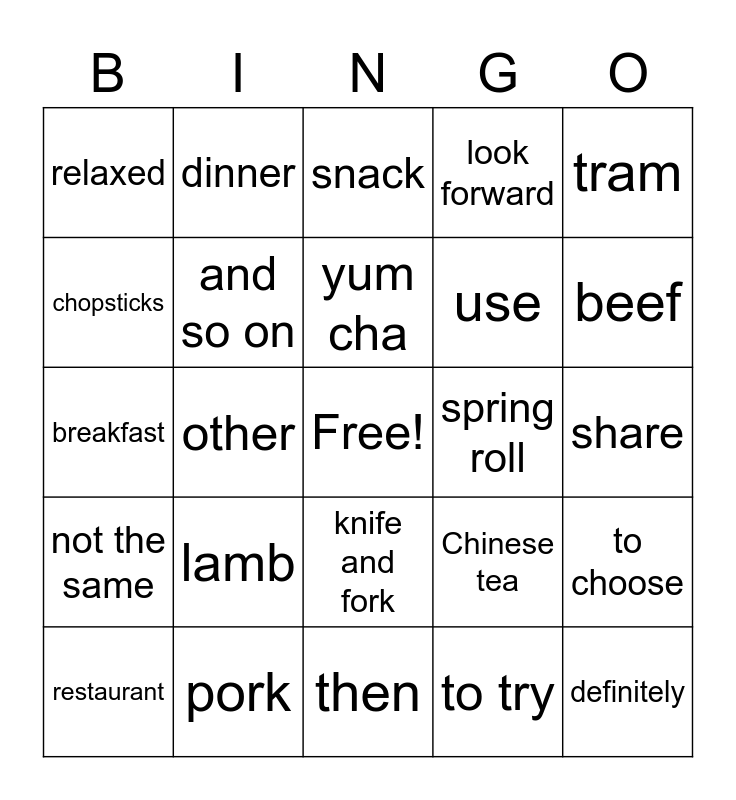 This bingo card has a free space and 34 words: often, to try, introduce, general, not the same, and so on, tram, restaurant, dinner, lunch, yum cha, snack, fried noodles, prawn dumplings, spring roll, beef, pork, breakfast, lamb, Chinese tea, knife and fork, chat, relaxed, share, then, definitely, look forward, seafood, use, chopsticks, green tea, other, to choose and train.