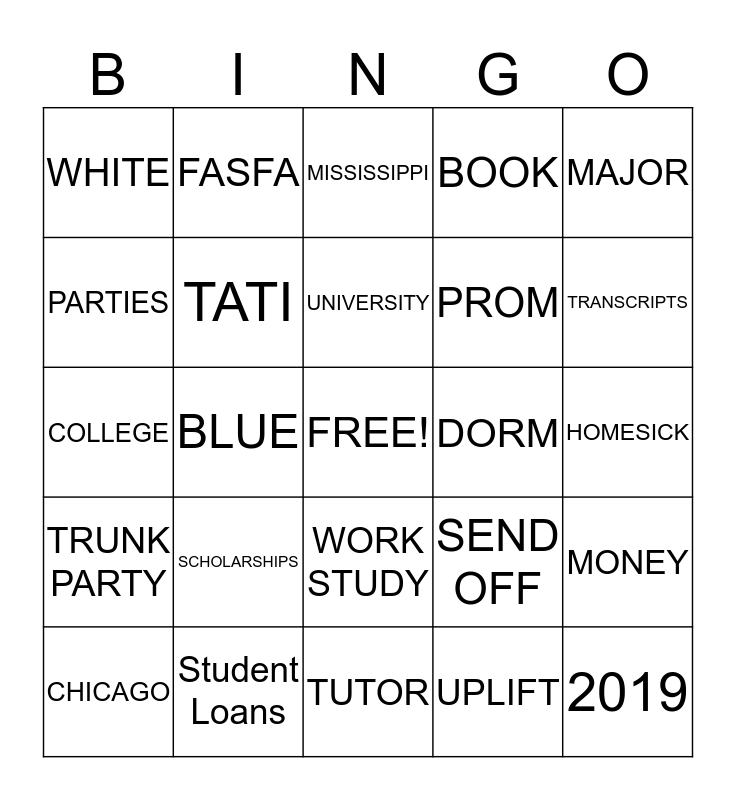This bingo card has a free space and 30 words: Student Loans, JSU, BLUE, GRAY, WHITE, MISSISSIPPI, TATI, WORK STUDY, DORM, TUTOR, HOMESICK, 2019, UPLIFT, HOMECOMING, TRANSCRIPTS, TIGERS, SEND OFF, TRUNK PARTY, SCHOLARSHIPS, MAJOR, COLLEGE, NEW START, FASFA, PROM, PARTIES, BOOK, MONEY, CHICAGO, UNIVERSITY and SPORTS.