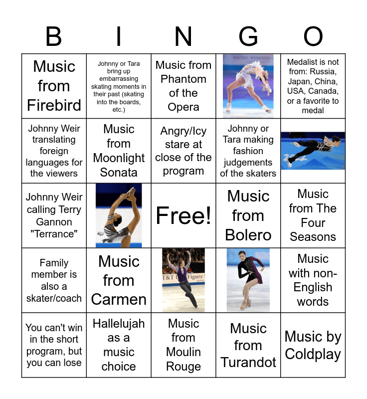 This bingo card has 7 images, a free space and 22 words: You can't win in the short program, but you can lose, Tired legs, Music from Swan Lake, Music from Firebird, Music from Phantom of the Opera, Music from Moonlight Sonata, Music from Carmen, Music from Bolero, Hallelujah as a music choice, Music from The Four Seasons, Music by Coldplay, Music from Moulin Rouge, Music from Turandot, Family member is also a skater/coach, Medalist is not from: Russia, Japan, China, USA, Canada, or a favorite to medal, Johnny Weir calling Terry Gannon "Terrance", Johnny or Tara making fashion judgements of the skaters, Johnny Weir translating foreign languages for the viewers, Johnny or Tara bring up embarrassing skating moments in their past (skating into the boards, etc.), Music with non-English words, Angry/Icy stare at close of the program and Crying in the Kiss & Cry.