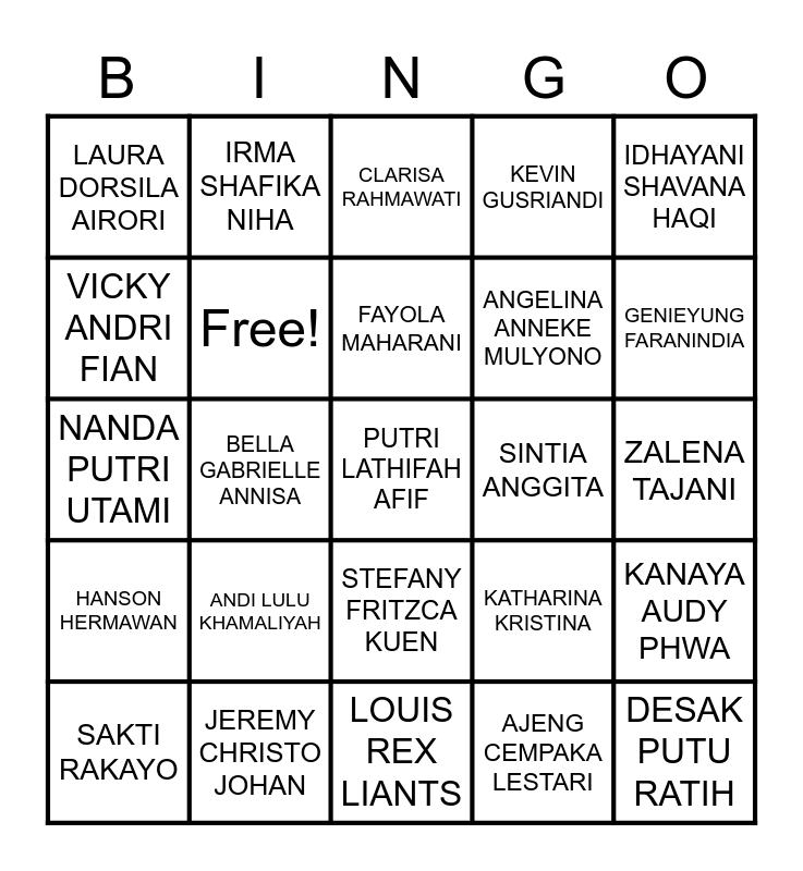 This bingo card has 1 images and 81 words: MAHARRANI NUR RAHMA, CLARISA RAHMAWATI, FELIKS ANTONIO, ARIN SEPTARINI, NI PUTU WINDYA, NADILA NINDYTA, PRIESCILLA PUTRI, LOLY ADINDA PUTRI, DESY PUTRI OKTAVIA, NI PUTU MARYATI, TIARA PATRICIA, Free!, SINTIA ANGGITA, WAHIDDIN BAKRI FIMBAY, LAURA DORSILA AIRORI, SAKTI RAKAYO, VICKY ANDRI FIAN, SYARIFAH NUR SILFIYAH, MEISYA NURAHMASARI, ANDI SYAKHRUL RAMADHAN, ANGELINA ANNEKE MULYONO, PUTRI LATHIFAH AFIF, IDHAYANI SHAVANA HAQI, BELLA GABRIELLE ANNISA, EDRIC LIM, ZACKY AHMED, MUHAMMAD DAFFA PANDEGA, BINTANG INDRABAYU AJI, ADIANTO JUNIARDI PRAKOSO, ANDI LULU KHAMALIYAH, ANASTASIA AUDREY GUNAWAN, NANDA PUTRI UTAMI, DESAK PUTU RATIH, MADELEINE ROBERTA, LOUIS REX LIANTS, KAZUYOSHI TANIMOTO, MUHAMMAD RAFLY AZIS, GENIEYUNG FARANINDIA, AUDREY DHAMARA ELYSIA, JESSICA WAHYUDI, KEVIN GUSRIANDI, TESSALONIKA ADE ERSANTI, ELVIRA DWI HAPSARI, CHRISTHALIA GABRIELA, IRMA SHAFIKA NIHA, GUARDIOLA RAFAEL, FAYOLA MAHARANI, BARLI ADRIAN ULHAQ, NADA HASYA ZAKIYYAH, KIMBERLY PHWA, ZALENA TAJANI, JEREMY CHRISTO JOHAN, JEREMY MICHAEL HARIANTO, MUHAMMAD RA'IF HARYO, I PUTU GEDE BUJANA, EINJELLA PATSY, ASHER FORBESIAN SUGANDA, JORDI HILDIANTO, KATHARINA KRISTINA, NAFIT DE AMELIA, FELIX FIRMAN SUTANTO, HANSON HERMAWAN, MICHAEL DANIEL B, NATASHA ANGELICA B, TIFFANY NATHANIA, MATTHEW EZEKIEL HALIM, CHERRYLL HERYONO PUTRI, PRISCILLA NETHANIA, NATHANIA REGINA MAPALIE, DAVE JEREMIAH JONATHAN, NADIA FARAHDILLA AMALIA, STEFANY FRITZCA KUEN, AJENG CEMPAKA LESTARI, SILVESTER NATANAEL YESAYA, DHIYA AUFA ABDURRAHMAN, VICTORIA DEL GRACIA, BILLIAN CANARA, SHAVEEN GABRIEL, PRAYATANESWARA DWIPUTRI, KANAYA AUDY PHWA and ELLENA CHRISTY JOHAN.