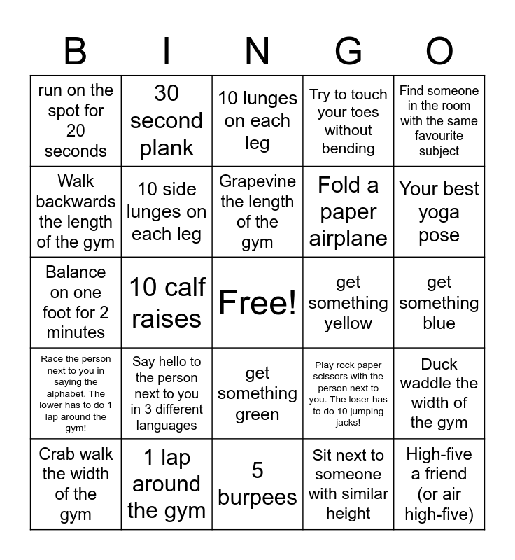 This bingo card has a free space and 30 words: 1 lap around the gym, 10 push-ups, 10 calf raises, 25 jumping jacks, run on the spot for 20 seconds, 10 lunges on each leg, 10 side lunges on each leg, get something green, get something yellow, 5 burpees, get something blue, High-five a friend (or air high-five), Sit next to someone with similar height, Give a compliment to someone you usually dont talk to, Your best yoga pose, Spin around 7 times and then give your best model walk, Play rock paper scissors with the person next to you. The loser has to do 10 jumping jacks!, Race the person next to you in saying the alphabet. The lower has to do 1 lap around the gym!, Say hello to the person next to you in 3 different languages, Find someone in the room with the same favourite subject, Balance on one foot for 2 minutes, 2 minute wall-sit, 30 second plank, Fold a paper airplane, Walk backwards the length of the gym, Try to touch your toes without bending, Duck waddle the width of the gym, Crab walk the width of the gym, Grapevine the length of the gym and High knees the length of the gym.
