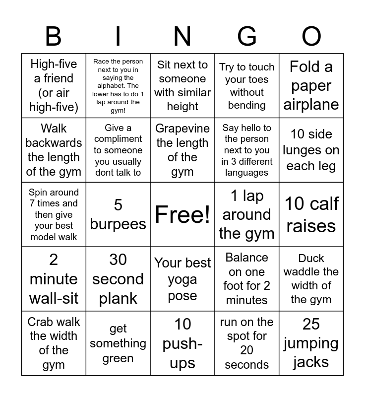 This bingo card has a free space and 30 words: get something green, get something yellow, 5 burpees, get something blue, High-five a friend (or air high-five), Sit next to someone with similar height, Give a compliment to someone you usually dont talk to, Your best yoga pose, 1 lap around the gym, 10 push-ups, 10 calf raises, 25 jumping jacks, run on the spot for 20 seconds, 10 lunges on each leg, 10 side lunges on each leg, Find someone in the room with the same favourite subject, Balance on one foot for 2 minutes, 2 minute wall-sit, 30 second plank, Fold a paper airplane, Spin around 7 times and then give your best model walk, Play rock paper scissors with the person next to you. The loser has to do 10 jumping jacks!, Race the person next to you in saying the alphabet. The lower has to do 1 lap around the gym!, Say hello to the person next to you in 3 different languages, Walk backwards the length of the gym, Try to touch your toes without bending, Duck waddle the width of the gym, Crab walk the width of the gym, Grapevine the length of the gym and High knees the length of the gym.