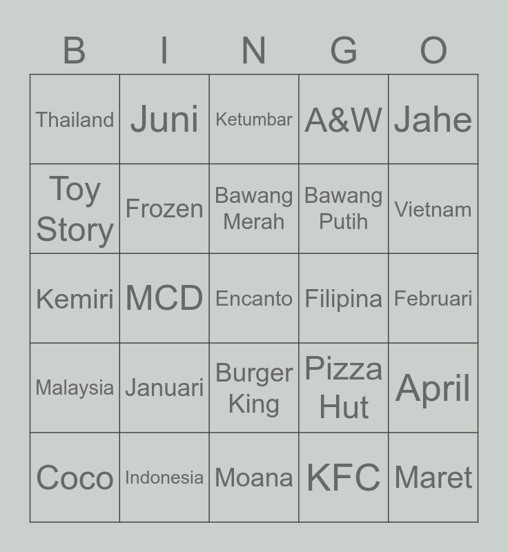 This bingo card has a free space and 24 words: Januari, Indonesia, Bawang Merah, Coco, Jahe, Thailand, Toy Story, Juni, Filipina, Burger King, Bawang Putih, Kemiri, Pizza Hut, April, Frozen, KFC, Februari, Ketumbar, Vietnam, MCD, Maret, Malaysia, A&W and Moana.