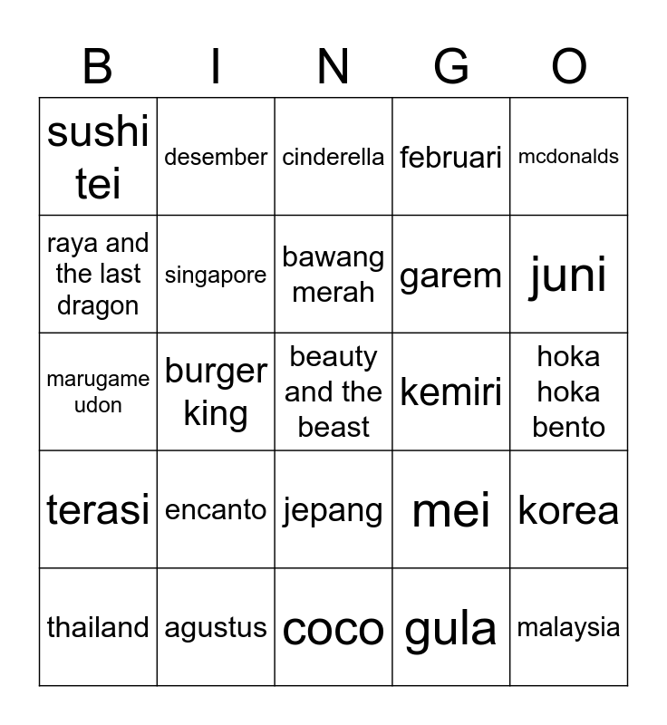 This bingo card has a free space and 24 words: encanto, agustus, bawang merah, thailand, mcdonalds, sushi tei, raya and the last dragon, desember, kemiri, jepang, garem, marugame udon, mei, korea, singapore, gula, hoka hoka bento, cinderella, juni, burger king, malaysia, terasi, februari and coco.