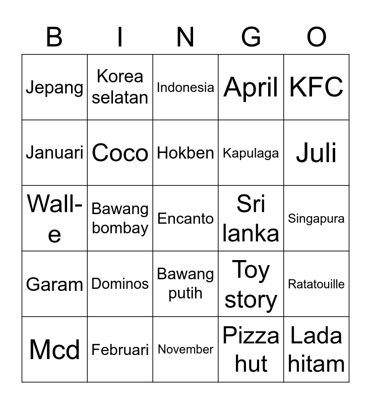This bingo card has a free space and 24 words: Mcd, Dominos, Hokben, Pizza hut, KFC, Jepang, Korea selatan, Indonesia, Sri lanka, Singapura, Wall-e, Coco, Toy story, Ratatouille, Januari, Februari, November, April, Juli, Garam, Bawang bombay, Bawang putih, Kapulaga and Lada hitam.