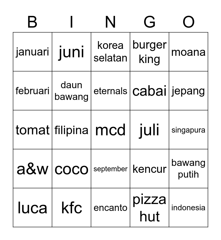 This bingo card has 25 words: coco, encanto, eternals, luca, moana, januari, februari, juni, juli, september, cabai, tomat, kencur, bawang putih, daun bawang, indonesia, singapura, korea selatan, jepang, filipina, mcd, kfc, a&w, burger king and pizza hut.