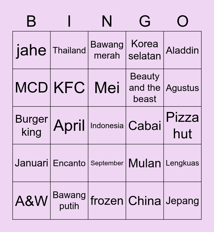 This bingo card has a free space and 24 words: Encanto, Bawang putih, Mei, A&W, Aladdin, jahe, MCD, Thailand, Cabai, September, Beauty and the beast, Burger king, Mulan, Lengkuas, KFC, China, Pizza hut, Bawang merah, Agustus, April, Jepang, Januari, Korea selatan and frozen.