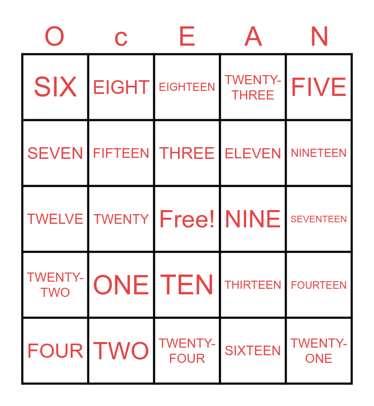 This bingo card has a free space and 24 words: ONE, TWO, THREE, FOUR, FIVE, SIX, SEVEN, EIGHT, NINE, TEN, ELEVEN, TWELVE, THIRTEEN, FOURTEEN, FIFTEEN, SIXTEEN, SEVENTEEN, EIGHTEEN, NINETEEN, TWENTY, TWENTY-ONE, TWENTY-TWO, TWENTY-THREE and TWENTY-FOUR.