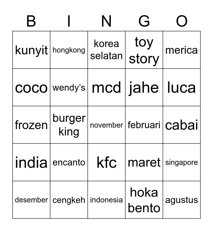 This bingo card has 25 words: encanto, indonesia, mcd, desember, merica, kunyit, coco, hongkong, februari, kfc, jahe, frozen, maret, singapore, wendy’s, agustus, cabai, korea selatan, luca, burger king, november, cengkeh, india, toy story and hoka bento.