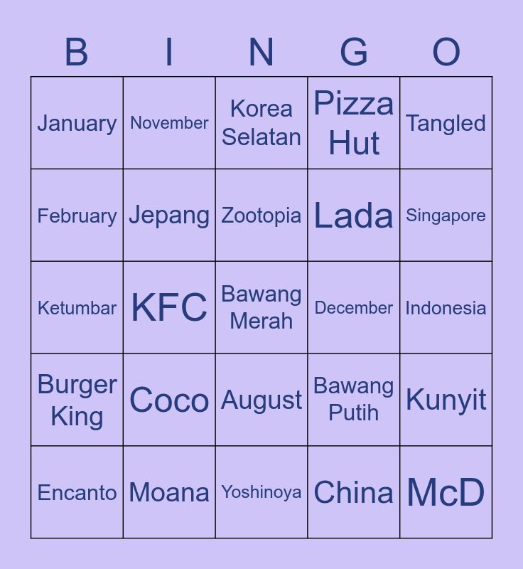 This bingo card has a free space and 24 words: Coco, Moana, Zootopia, Encanto, Tangled, January, February, November, December, August, Lada, Ketumbar, Bawang Putih, Kunyit, Jepang, China, Indonesia, Korea Selatan, Singapore, KFC, McD, Burger King, Pizza Hut and Yoshinoya.