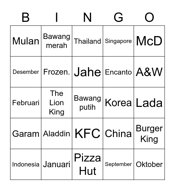 This bingo card has a free space and 24 words: Aladdin, Januari, Jahe, Indonesia, McD, Mulan, Desember, Bawang merah, Korea, KFC, Encanto, Februari, China, Burger King, Frozen., September, Lada, Thailand, A&W, The Lion King, Oktober, Garam, Singapore and Pizza Hut.