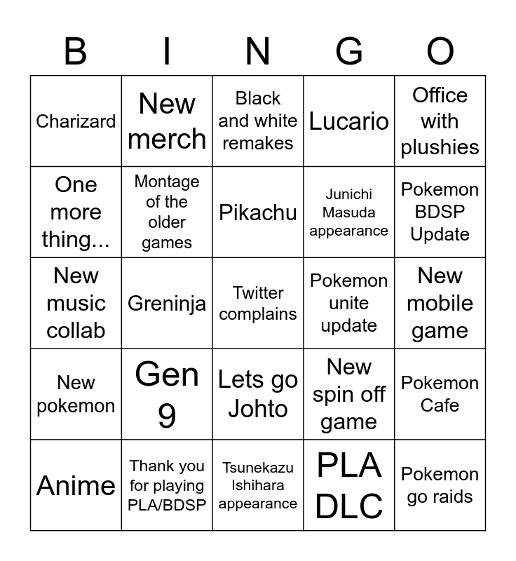 This bingo card has a free space and 24 words: Gen 9, Thank you for playing PLA/BDSP, Pikachu, Anime, Office with plushies, Charizard, One more thing..., New merch, Pokemon unite update, Lets go Johto, Junichi Masuda appearance, New music collab, New spin off game, Pokemon Cafe, Montage of the older games, PLA DLC, New mobile game, Black and white remakes, Pokemon BDSP Update, Greninja, Pokemon go raids, New pokemon, Lucario and Tsunekazu Ishihara appearance.