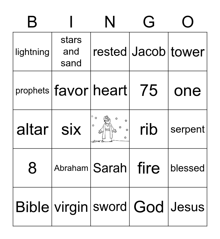 This bingo card has a free space and 29 words: Bible, Holy Spirit, six, cherubim, lightning, rested, favor, Abraham, rib, virgin, serpent, Jesus, sword, God, one, 40, Sarah, 8, tower, altar, fire, Us, 75, prophets, Jacob, stars and sand, blessed, heart and blood of Jesus.