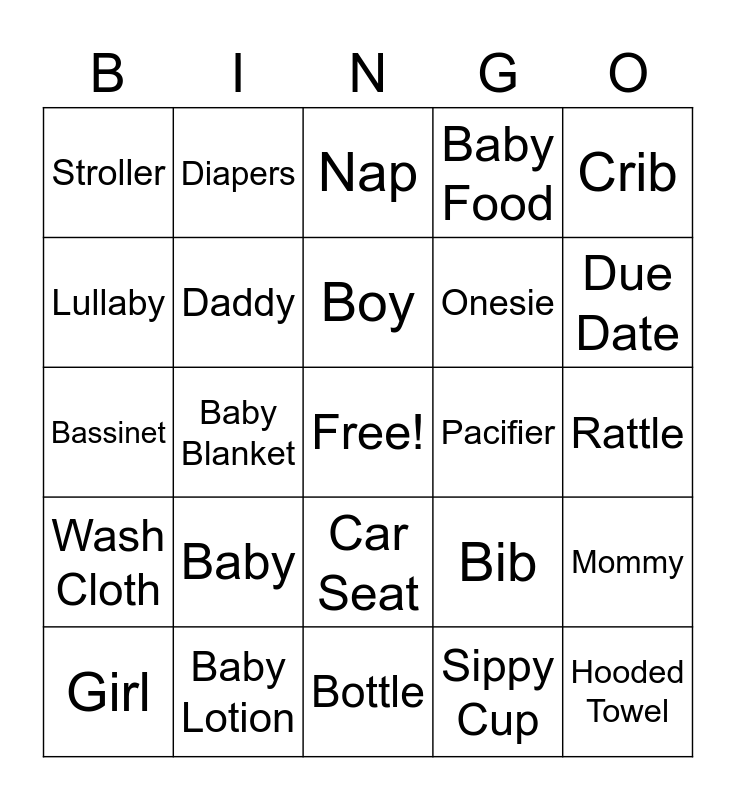 This bingo card has a free space and 25 words: Baby, Bottle, Boy, Girl, Crib, Stroller, Lullaby, Diapers, Pacifier, Car Seat, Onesie, Bassinet, Bib, Mommy, Daddy, Rubber ducky, Rattle, Nap, Due Date, Baby Blanket, Hooded Towel, Baby Lotion, Wash Cloth, Baby Food and Sippy Cup.